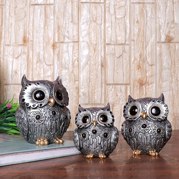 Handcrafted Owl Figurine Set – Decorative Showpiece With Three Different size (Large: 15cm H x 11cm L x 10cm D, Medium: 14cm H x 10cm L x 9cm D, Small: 8cm H x 6cm L x 6cm D)